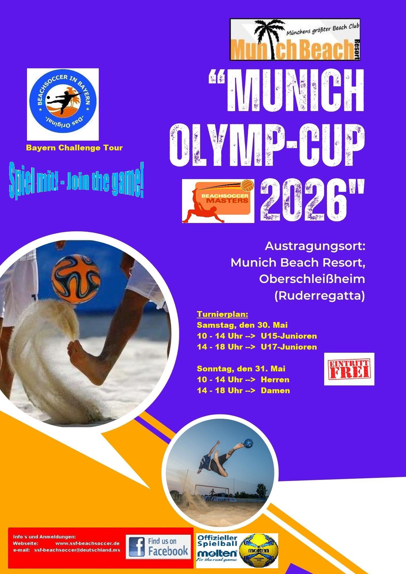 Wir, der "Beachsoccer in Bayern"-Verband organisieren mit der Bayern Challenge Tour die Qualifikationsturniere zu weiteren nationalen und internationalen Meisterschaften. Auf dieser Webseite erhalten Sie alle Informationen (Termine, Masters Turnierorte, Anmeldungen, Regelwerk usw.)